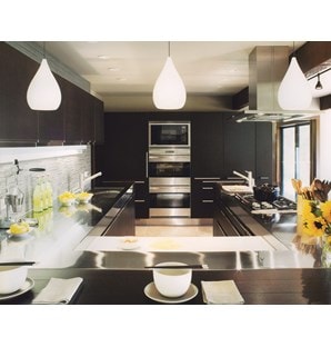 For a family of four—two children in school and two adults that frequently work from home—putting computer stations, dining and cooking functions closer together gave them more opportunities to be together. Their California lifestyle also includes healthy food prepared by the owner—an avid home chef—who designs her family's meals around what's fresh at the farmer's market. "She needed a command center," says Stacy Eisenmann of Arclinea San Francisco, who created the kitchen with her colleague Eriche Wilson. Doors and low walls between an office and the kitchen were removed and the yellow surfaces and floral fabrics of the last kitchen remodel are also history. Today the space shares a palette appropriate to the rest of the Asian modern interiors. A huge wood ceiling beam—a feature that repeats throughout the home—now spans the kitchen, island and office. A large refrigerator was important to store fresh produce and the integrated Sub-Zero preserves the flawless minimalist design featuring oak cabinetry with Wenge stain. At the U-shape island with three tiers on one end, the homeowner can cook, plate, serve and converse at ease with family, and with friends during frequent dinner parties. The lowest tier is marble for dough preparation, the middle is work surface and the upper tier serves as family dining or buffet space.