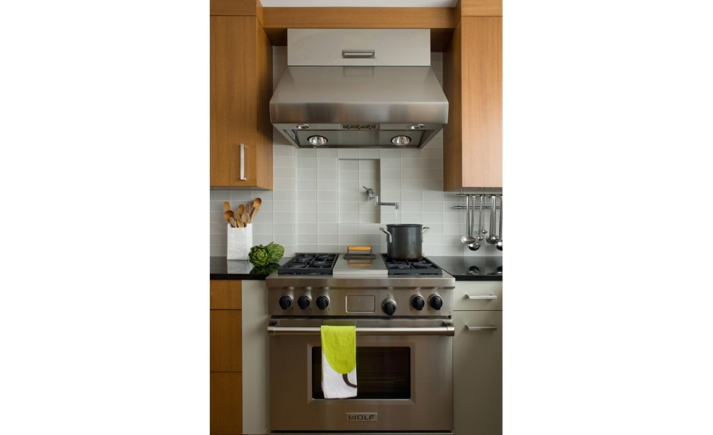 Knowing the clients both really like to cook, especially French cuisine, he put the kitchen at the center of the penthouse, and to set out to make it comfortable for the couple to work in together. Three custom pot racks above the island put an innovative spin on an old classic and define the space with ergonomic utility. "If they're tucked away sometimes you just grab what's easiest," Hacin says. "Here, they can see them and think about exactly which pot or pan is the best for what they're doing. Really great control was important to them," he adds. "Sauces factor in with French cooking—and they like the simmer options the Wolf provides. Cooking is how they relax together. The kitchen feels natural and seamless with this house, and the finishes and colors are what achieved that."