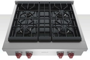 Wolf's gas rangetop delivers flexibility with dual-stacked, sealed burners and optional charbroiler, griddle, or wok burner. Front-facing knobs are available in red, black, brushed stainless, brushed brass, and brushed gray.