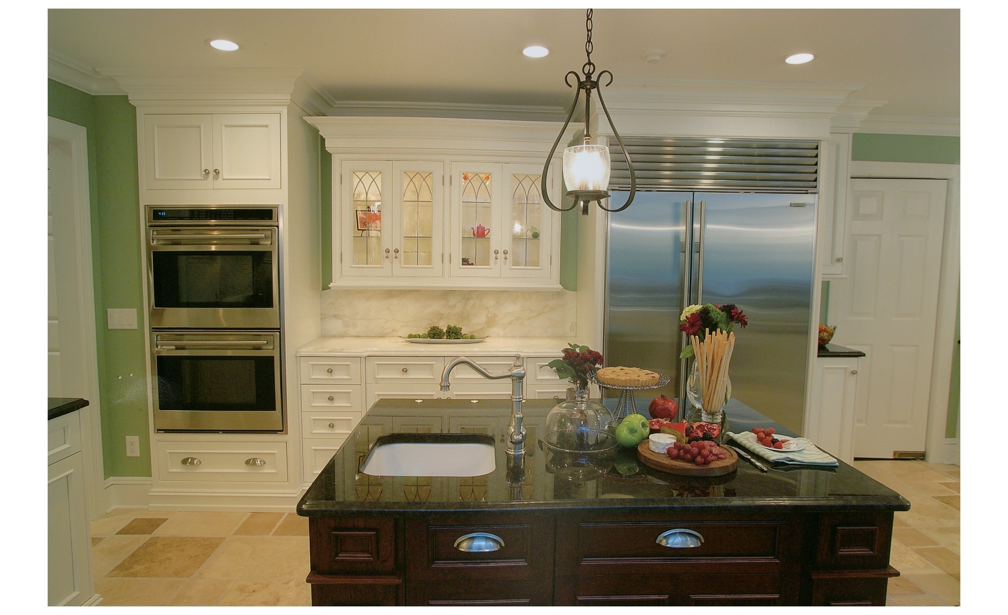 Ian Cairl of Platinum Designs took one look at the adjacent, underutilized sun room all alone in the corner and knew exactly what to do: remove the wall between the rooms to merge them and then marry them visually. Two generous islands now provide great workspace, and guests have multiple places to hang out while keeping the cook company. A custom bench and table overlooking the garden seats up to 10 when the leaves are in place: the perfect spot for homework, crafts, play dates, office work, games and puzzles. A Sub-Zero undercounter fridge near the table, hidden by matching cabinetry, keeps snacks and mealtime essentials nearby. To maintain the feeling of extensive space, walls on either side of the range hood were kept open. This highlights the Wolf 36-inch gas rangetop with sconce lighting and marble backsplash. Even the Wolf oven controls that slip away for a clean look add to the kitchen's new identity as a space for living. "They were putting value on time together and getting the most from their home," says Cairl. "It's not about budget or even about the footprint— it's about being creative in using that footprint. Don't think of spaces as separate. You can merge functions like play dates and entertaining for small and large parties. A place you feel happy and comfortable is really, really important. Regret is really expensive!