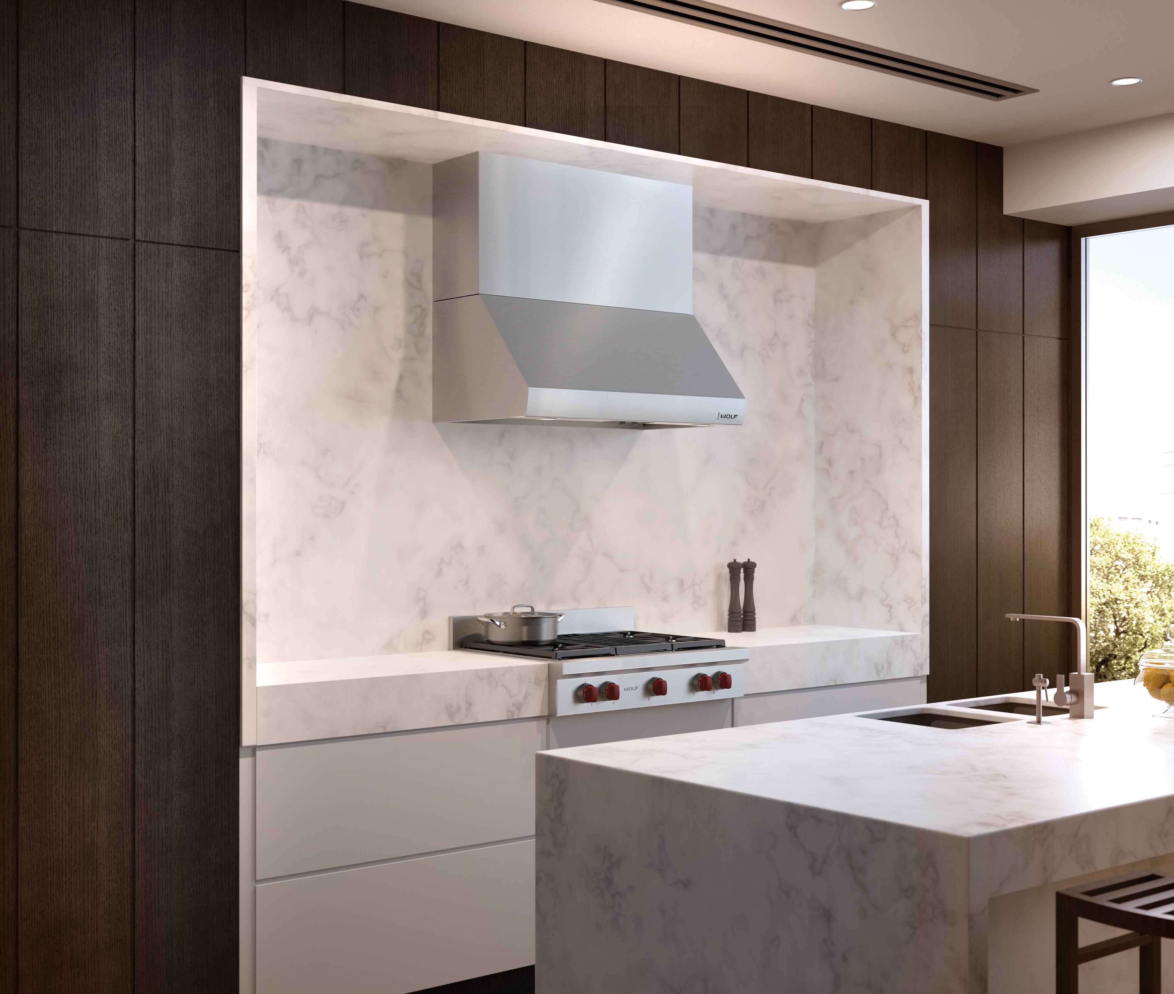 Installs over your 42” wide ventilation hood to complete the look of your Sub-Zero, Wolf, and Cove kitchen design.