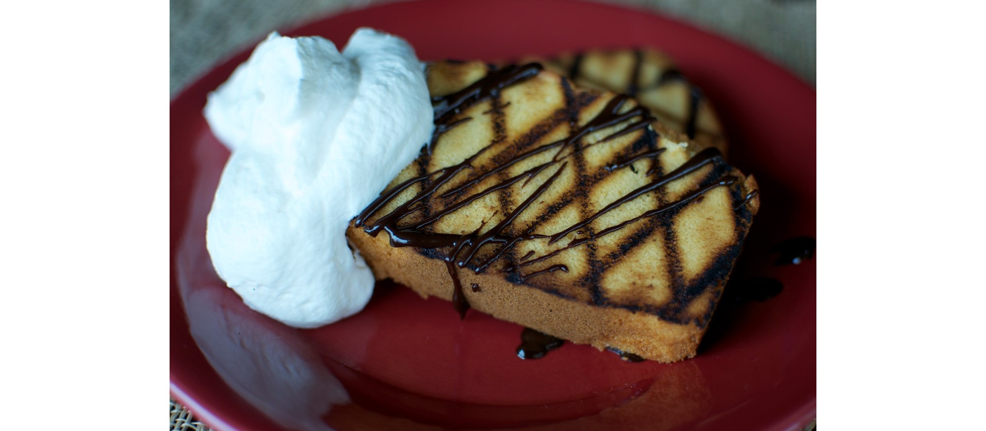 Quatre-quarts grillé avec sauce au chocolat et crème fouettée